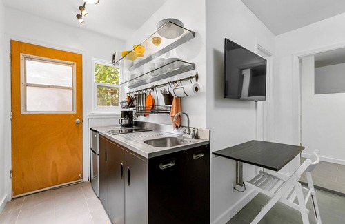 When it comes to sleeping arrangements, each bedroom has something unique to offer. Downstairs, the first bedroom doubles as an office with a workstation - complete with high-speed internet. On the second floor, the guest bedroom adds a touch of sophistication with a four-poster bed, and the primary suite wows with a large jetted tub with impeccable garden views. This home also boasts a studio with a separate entry for added privacy. This studio is perfect for people looking for a private space away from others (even for a bit)! This space boasts an inviting living area with a sofa bed, a TV, a working space with a desk, and a well-appointed kitchenette with a mini-fridge, two-burner stovetop, coffee maker, and utensils.