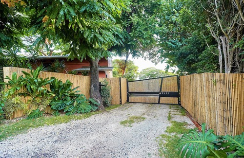 It is gated, access by remote or keypad, that opens, under the majestic canopy of a monkey-pod tree, to large open area (over 3000 sf) that may serve as well as car port. Opposite the house, in a separate, private corner of the garden, there is a 200 sf BBQ and sitting area, beautiful views.