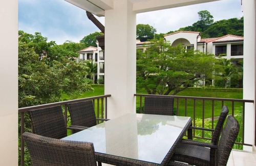 The 3rd-floor, 3-bedroom, 2-bath Pacifico L615 in Coco has a pool-view balcony with an outdoor dining table that seats six.