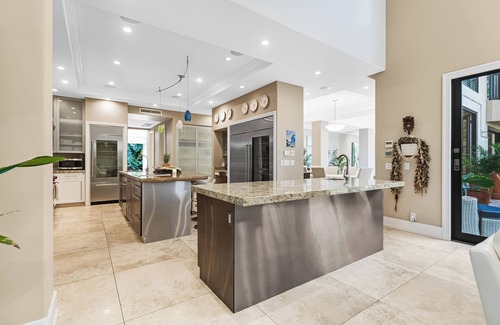 * A chef’s kitchen featuring two refrigerators, two dishwashers, a gas stove, dual islands with seating for six, and a walk-in pantry.
