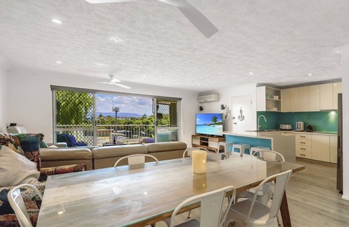 Step into a generously proportioned top-floor apartment designed for comfort and ease. The light-filled living room offers a large five-seater couch, a Smart TV with streaming options, and tasteful styling with decorative elements and a soft rug underfoot. Adjacent to the lounge is a cosy dining area with seating for six and an open kitchen equipped with modern appliances including a coffee machine, microwave, oven, and electric cooktop.