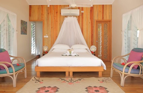 Our Deluxe Oceanfront Bures are beautifully situated in our lush garden on the beachfront. Each has an interior and private outdoor shower. The King beds can be separated to accommodate different sleeping arrangements. The bures are equipped with air conditioning (extra charge during cool season) and remote controlled ceiling fans. Bures are set back in the garden/rainforest to provide provide privacy while being just steps from the beach.