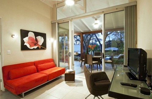Sleekness and simple elegance are synonymous with THE BREEZE. From the living room's stylish red sofa to the bedroom's tasteful bed linens, the décor has been meticulously chosen by the proprietors to blend boutique hotel-style intimacy with a flair for the cosmopolitan. Among the many amenities are air conditioning in all bedrooms, 2 flatscreen TV's per unit, hi-speed wireless internet, daily 24-hour security within a gated community, free maid service, and babysitting and laundry services for a fee.