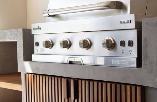Outdoor patio and dining area, with gas BBQ and poolside furniture